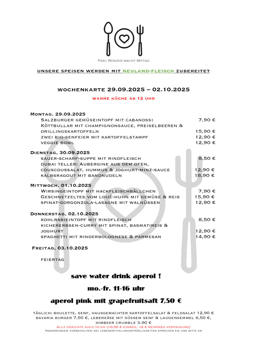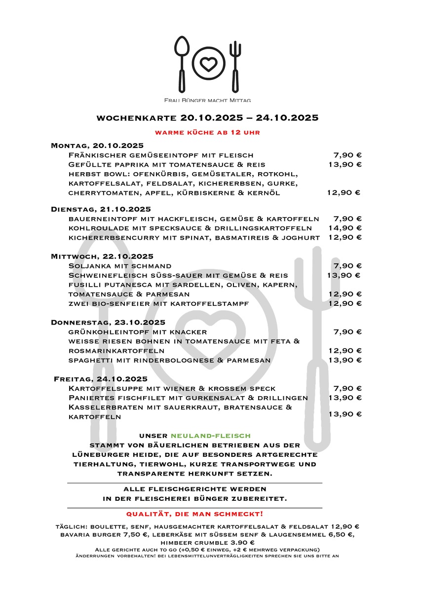 - täglich wechselnde Gerichte aus Neuland Fleisch (artgerechte Nutztierhaltung)